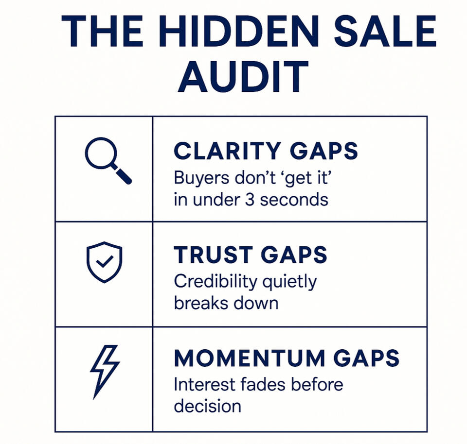 Your prospects aren’t rejecting youThey’re stuck.Get your free sales audit and I'll identify exactly where deals slip away and how to fix each leak in a 15-minute results call.